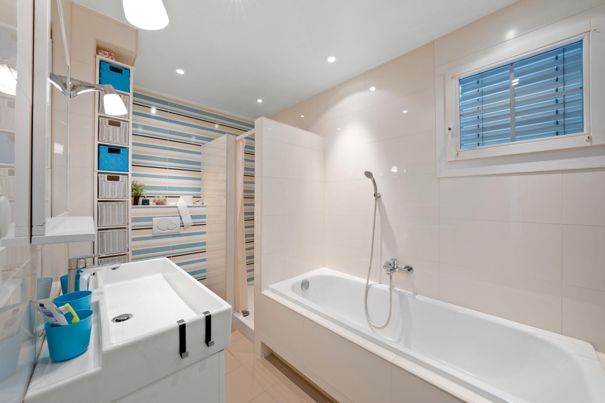 Le premier étage dispose de trois chambres et d’une salle d’eau avec baignoire et douche.