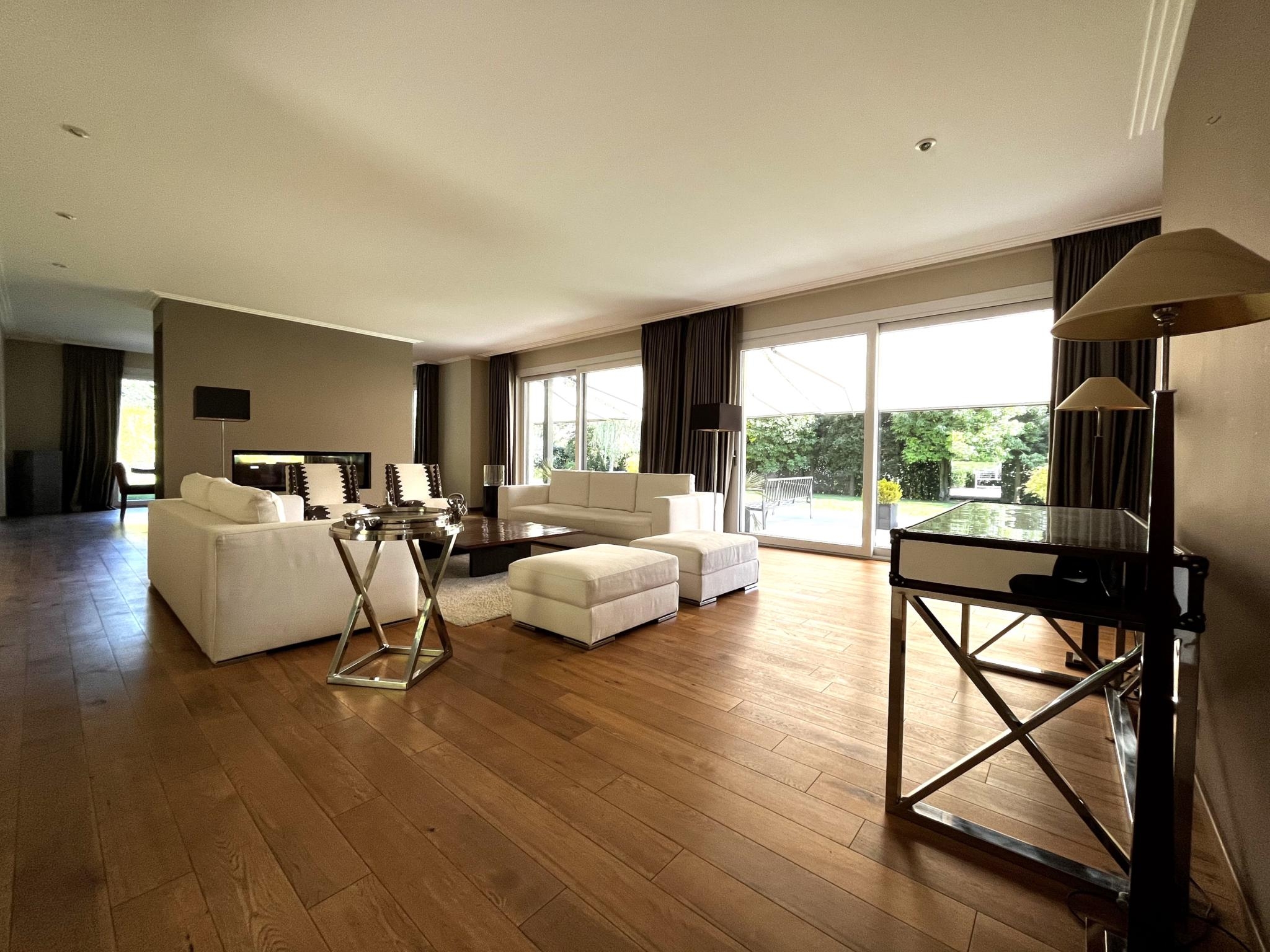 Le rez-de-chaussée comprend un élégant hall d’entrée avec une belle hauteur sous plafond, un vestiaire fermé, WC invités, un bureau, 3 pièces de réception attenantes avec cheminée et une cuisine indépendante entièrement équipée avec des prestations de qualités.