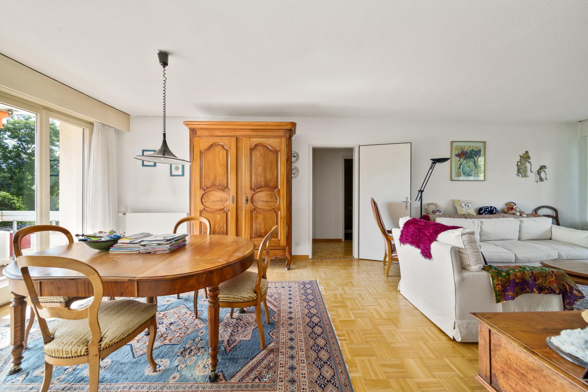 Le séjour traversant et lumineux donne accès sur deux balcons au calme (un côté sud-ouest et l’autre côté nord-ouest) où vous pourrez profiter de moments de détentes en plein air avec une vue dégagée sur la forêt et le Mont-Blanc.