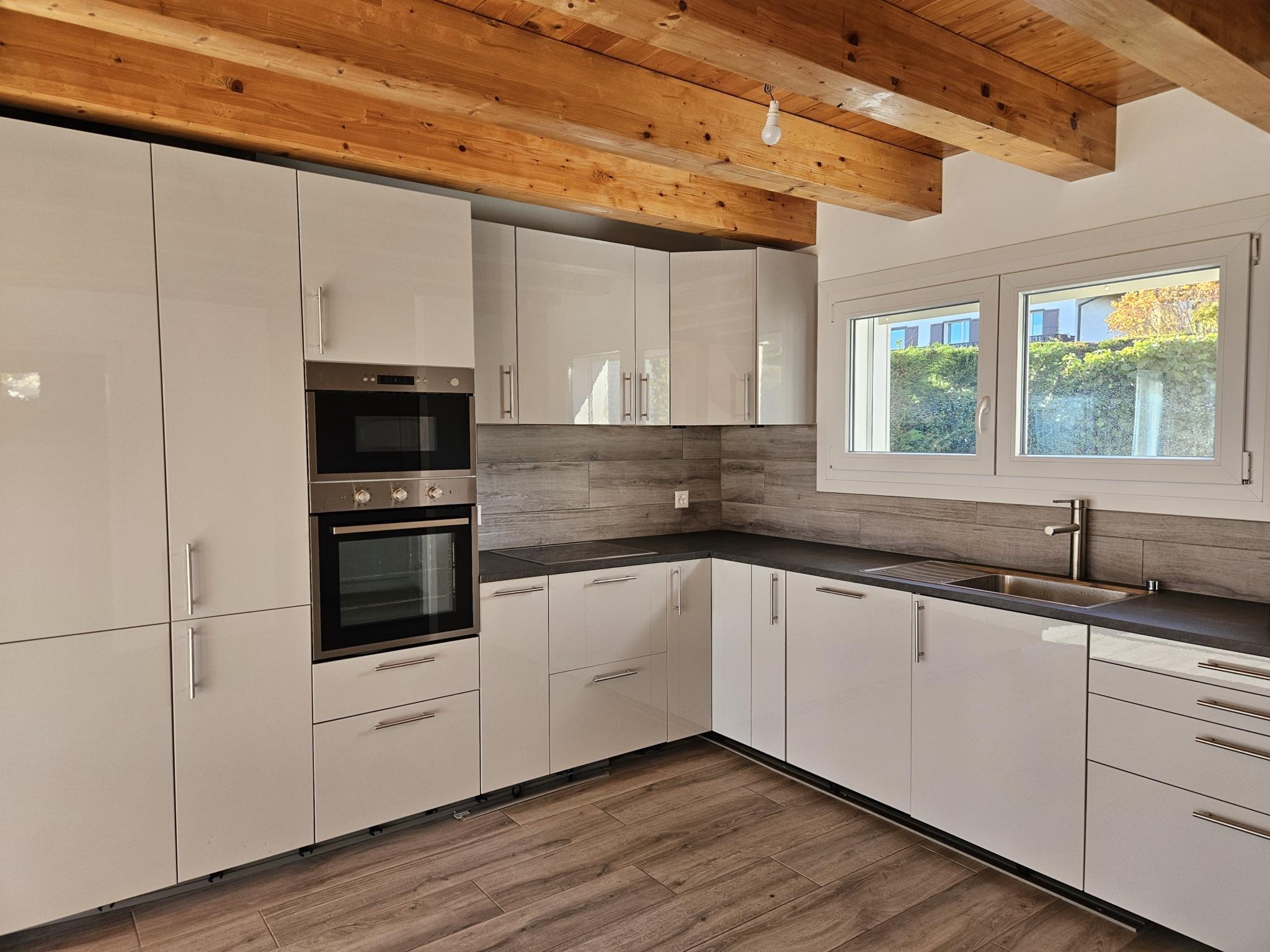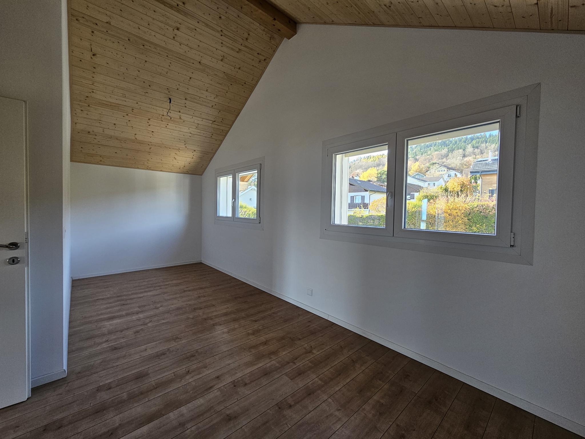 À l’extérieur, une agréable terrasse permet de profiter pleinement de la vue dégagée, tandis qu’un couvert pour deux voitures et plusieurs places de parc complètent ce bien.